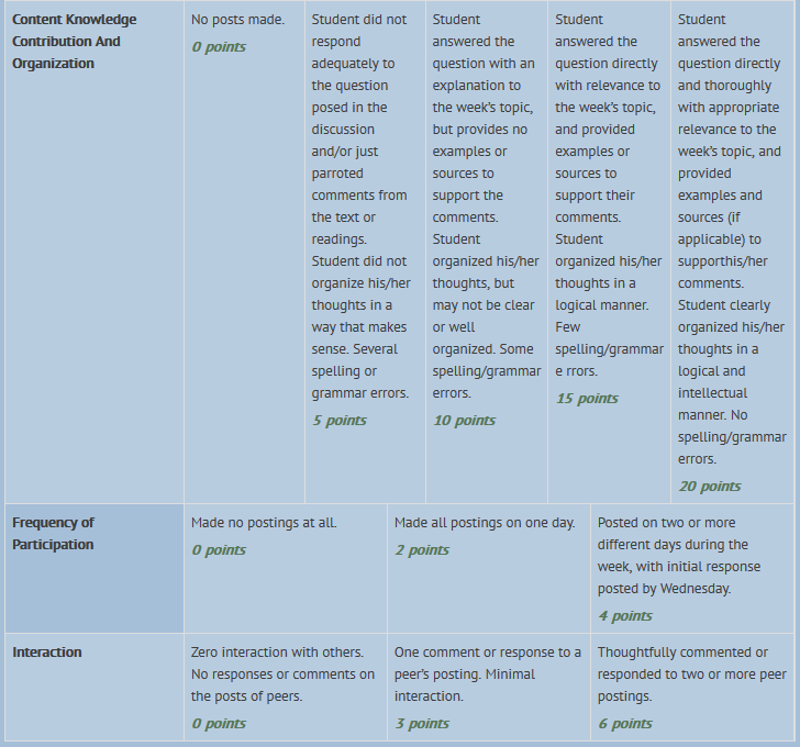 Click here for the Threaded Discussion Grading Rubric for specific grading criteria.